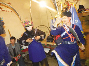 請“臉子”是地戲表演時一個非常講究的開場儀式?!巴捅さ貞颉钡恼埬樧觾x式通常是整個戲班子的人都必須參加祭拜。表演時必須鄭重地從箱子里請出珍藏的“臉子”,“臉子”才具有神的靈性??墒俏覀兛吹降拇笳家赖貞?,在保持傳統(tǒng)的同時又不失自己的個性。通常請“臉子”是由當(dāng)?shù)亻L老一個人完成所有的祭拜過程,一切都是那么簡單。祭拜中都是用當(dāng)?shù)氐牟家涝掓告傅纴?,這樣的表演給它增添了別有的韻味。