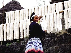 白褲瑤服飾的面料都是老阿婆手搖紡車,把一捆捆棉麻用勤勞智慧的巧手紡織成細(xì)紗,合著穗捻成勻稱的線。阿妹們再將線繞到線筒上,然后輕涮漂洗,繞到高腳糧倉下。線晾干后進行紡織,一塊塊自紡的棉紗土布就形成了,之后就可以在這塊布上盡情“作畫”了。