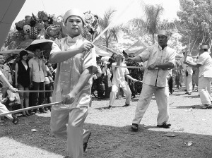 在云南西雙版納傣族自治州景洪市勐罕鎮(zhèn),作為當(dāng)?shù)亍吧贁?shù)民族傳統(tǒng)文化搶救與保護(hù)項(xiàng)目”之一的傣族武術(shù)培訓(xùn)班已經(jīng)開班。來自景洪市嘎灑、勐罕、勐龍等鄉(xiāng)鎮(zhèn)的50多名傣族學(xué)員在這里開始了民族武術(shù)的學(xué)習(xí)。