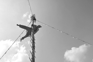 雖然符長洪教了理論絕招,可是在真刀、真火面前,第一次上場的徒弟們還是搖頭再搖頭,扭捏不敢上。此時,恰逢村里有人家邀請符長洪去表演,他就趁機(jī)帶著徒弟一起去。表演現(xiàn)場,符長洪用布包著刀刃,要幾個徒弟爬上刀梯。徒弟們上到梯頂后,符長洪卻把布條扯開,露出亮晃晃的刀刃,并在刀梯四周點(diǎn)燃火堆大喊:“下來吧!踩到刀上,走過火堆,你們就出師了!”