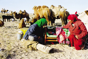 每戶人家的家就在那三四頭駱駝的背上,駱駝的先后排列也是有講究的。一般第一峰駱駝負(fù)責(zé)運(yùn)被褥,婦女和小孩也坐第一峰駱駝。后面的駱駝則運(yùn)衣服、日用品、食物、氈房的羊毛氈和氈房骨架。家里的男人們則騎著馬,趕著大群的牛羊緊跟在后面。平時(shí)來往較少的牧民們因?yàn)檗D(zhuǎn)場(chǎng),有了歡聚的機(jī)會(huì)。每天下午,牧民們就開始在路上安營(yíng)扎寨,男人們開始從駝背上卸下氈房,在路邊搭建臨時(shí)簡(jiǎn)易氈房;女人們生火煮飯,孩子們成群地奔跑嬉鬧,每家的牧羊狗或打架或形影不離。緩緩的炊煙在金色的黃昏中飄散,男人們開始圍在篝火旁喝酒唱歌,火光映紅每一張黝黑的臉龐,悠遠(yuǎn)的歌聲在空曠的夜空飄蕩。