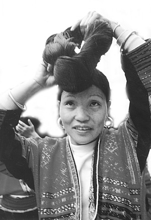 我們來(lái)到廣西龍勝各族自治縣和平鄉(xiāng)黃洛紅瑤寨時(shí),還沒(méi)有進(jìn)寨,就看見(jiàn)三三兩兩的婦女在河水清清的河邊洗頭。她們梳洗著清亮的發(fā)絲,1.6米左右的頭發(fā)又長(zhǎng)又黑,飄飄灑灑。長(zhǎng)發(fā)是紅瑤女的一大特色,紅瑤有世代相傳的蓄發(fā)、護(hù)發(fā)、梳妝發(fā)型的秘方。紅瑤女十二三歲開(kāi)始蓄發(fā),長(zhǎng)到一定的長(zhǎng)度可以剪下珍藏。等到30歲左右,就可以和秀發(fā)一同盤(pán)起。