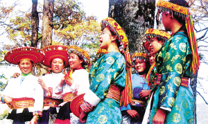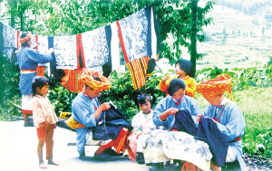 這是一個(gè)特別愛美的民族。男人們著裝瀟灑隨意,頭纏黑白相間的方格頭帕,倍顯英俊。女人們則身穿黛藍(lán)色對襟長衫,鑲著的紅布邊和紅布扣純?yōu)檠b飾。下著素艷相融的花裹裙,腰纏五顏六色的腰帶,頭上再配一個(gè)后面吊有長長彩須、狀似倒扣斗篷的火紅頭巾,把個(gè)茫茫綠野點(diǎn)綴得山花爛漫、如畫如詩。