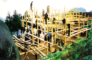 花瑤同胞修建新屋,至今沿襲著奇特古老的巫風(fēng)。對于宅基地的選擇要請地仙擇地,幫助選向和挑選動(dòng)工日期。待三柱或五柱一扇的木架子做好后,豎架上梁的那天,全寨的親鄰都會(huì)主動(dòng)來幫忙。用繩子拉的、用叉子撐的、用肩膀頂?shù)?、用木槌敲的、用雙手推的,各居各位后,一聲喊起,—扇木架瞬間立于宅基上了。