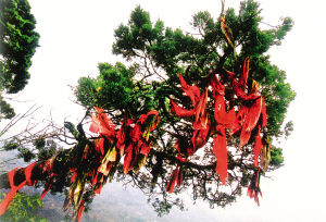花瑤同胞祖祖輩輩與寨子里的古樹久久相依。在他們心中,有著頑強(qiáng)生命力的老樹飽吸天地之靈氣,百年不腐,千年不朽,早已是神,時(shí)時(shí)都在庇佑他們。故對之倍加敬仰,又十分親近,誰都不會(huì)貿(mào)然去傷害它們。即便是蟲蛀樹空枯朽倒地,也不敢拖回家用,而是讓其自生自滅,還原于土。