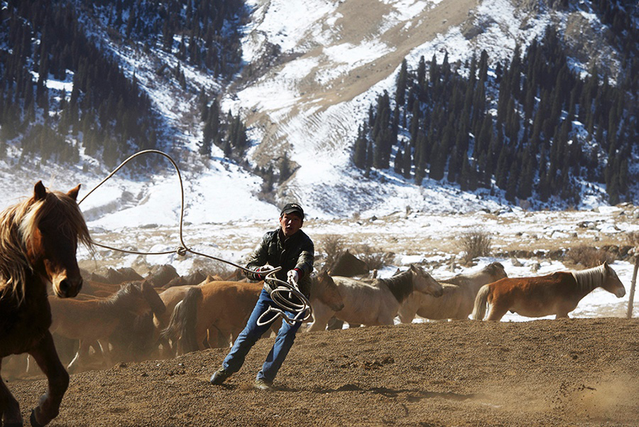 我首先到訪的是達(dá)楞達(dá)坂一帶。接待我的主人卡瑪儀表堂堂,60多歲還在照料自家的畜群。老人沒有興趣放羊,每天吆著100多匹馬和300頭牦牛在日月間往復(fù)。一望無際的雪原,把暴烈的馬群和野性難馴的牦牛吆往一個地方或再吆回去,騎馬的強度與奔跑的頻率遠(yuǎn)不是他這個年紀(jì)的人所能駕馭的了。但老人不這么想,他不愿意在和靜縣城的暖氣房子里喝茶陪孫子們,而更愿意在他的馬背上,每天奔波在雪原上。