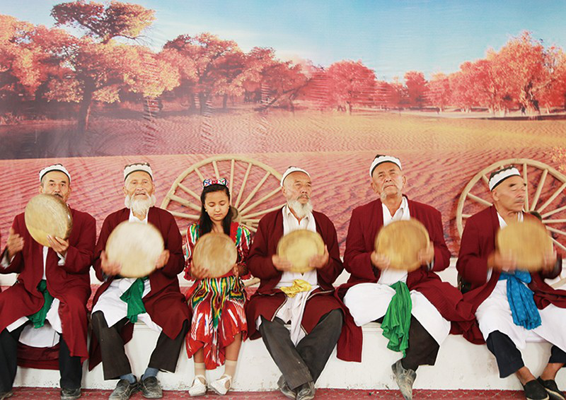 11歲的麥迪娜是小學(xué)五年級(jí)的副班長(zhǎng),在麥蓋提一小雙語(yǔ)班讀書(shū),漢語(yǔ)好到可以給我做翻譯,向老藝人提問(wèn)。麥迪娜的世界已經(jīng)和老藝人、和叢林中艱難漁獵的祖先不一樣了。她在麥西來(lái)甫中敲達(dá)甫手鼓,在活動(dòng)中心學(xué)習(xí)電子琴,是女子“手鼓樂(lè)隊(duì)組合”中8位11—3歲女孩子中的一個(gè)。她希望將來(lái)能在北京上學(xué)、成為醫(yī)生治好奶奶的糖尿病。她會(huì)用漢語(yǔ)唱國(guó)歌和《歌聲與微笑》,還有《茉莉花》,雖然吐字與調(diào)子不太那么準(zhǔn)。她圍著阿布都克萊姆(被稱作“維吾爾人的趙本山”的維吾爾族諧星)索要簽名的同時(shí),還喜歡羅志祥,以韓國(guó)偶像組合EXO為榜樣。麥迪娜還上過(guò)電視,常有喀什地區(qū)的、自治區(qū)的、全國(guó)的媒體到麥蓋提來(lái)采訪、錄制刀郎麥西來(lái)甫。