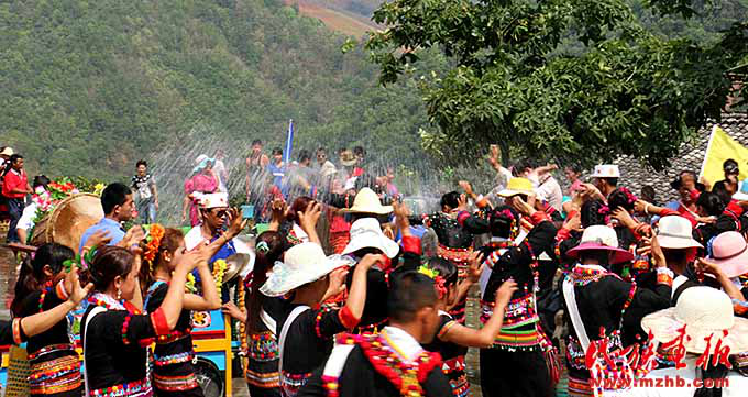 節(jié)日清晨,在象腳鼓樂和歌聲中,年輕人將水桶高高舉過頭頂,將水滴灑在老年人的手上,祝愿他們生活快樂、健康長壽。老人們則伸出雙手,將水捧在手中,口念祝詞,為年輕人道喜、祝福。這種儀式之后,人們便以象腳鼓為前導(dǎo),排成長隊,擁向泉邊、河畔,唱歌、跳舞,互相追逐、潑水。從頭到腳,全身濕透。這是吉祥的水,祝福的水,人們盡情地潑,盡情地澆,不論是潑水者還是被潑者,都高興異常,笑聲朗朗。楊臘苦介紹說,澆花節(jié)既是德昂族人民歡度新年的典禮,又是男女青年談情說愛,尋找心上人的好時機。