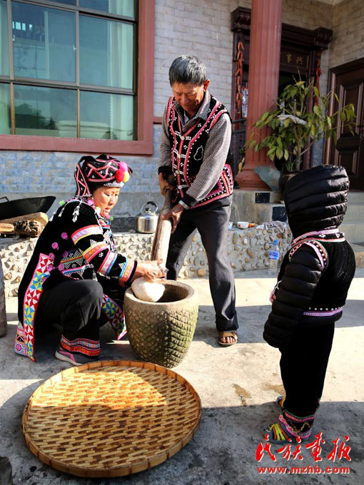 張俊波父母一起舂粑粑,準備正月初三拜年用