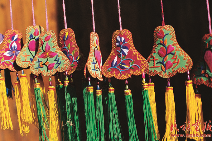 土族盤繡為當(dāng)?shù)貗D女帶來了不少經(jīng)濟(jì)收入。圖為線條流暢、層次豐富、撞色奔放、針腳細(xì)膩的土族盤繡荷包(祁春英 攝影)