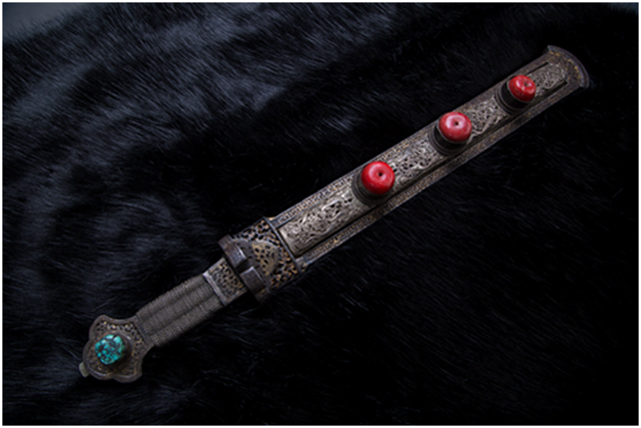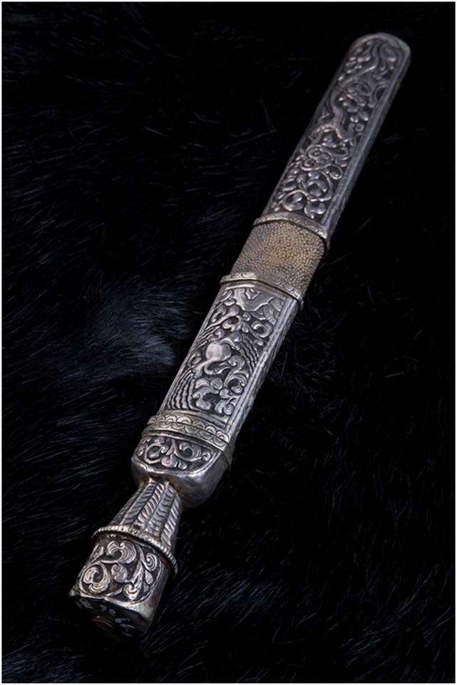 康區(qū)人性格粗獷豪放,刀對(duì)于他們來說,主要是戰(zhàn)斗的武器,他們愛刀勝過愛牛羊,一把好刀就是一筆財(cái)富,其形象也會(huì)因之而無形中高大起來。正因?yàn)槿绱耍麄儾粌H對(duì)刀本身有較高的要求,對(duì)其作為襯托武士氣概的刀的外在形制也有特殊的喜好。刀鞘材料一般使用黃、白銅或純銀,鑲珠嵌寶,正面雕龍畫鳳,背面線刻卷草,佩在身上,起到了美觀和威懾的雙重作用。