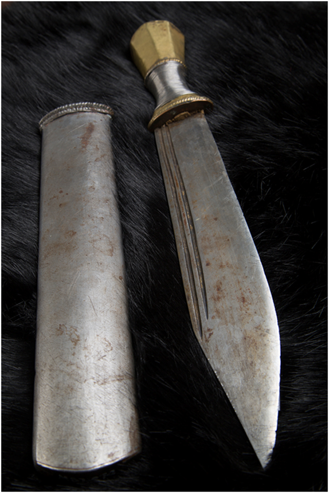 地處藏東的林芝地區(qū)一帶,也叫貢布地區(qū),居住著藏族、門巴族和珞巴族,這里山高林密,野獸出沒其間,靠山吃山,人們伐薪狩獵是家常便飯。所以人們使用的刀具以寬、長(zhǎng)為多。刀鞘多為木質(zhì),外面用獸皮包裹,一般是用野獸腿骨上的皮,有些還帶有爪子。外在裝飾主要是附在獸皮上的毛色和趾爪。其用途除了捕獵格斗,更是人們?cè)诿芰种信G斬棘的利器。