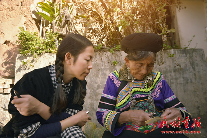 盧潔瑩下鄉(xiāng)向彝族老前輩請教彝繡圖案樣式(索玉文化美學創(chuàng)意有限公司 供圖)