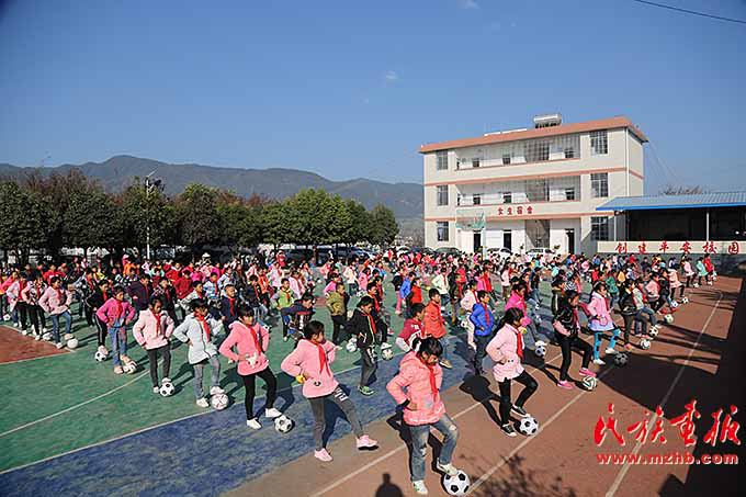 在新村聯(lián)排別墅的最南邊是中村鄉(xiāng)小學(xué),這所學(xué)校是同傈園新村相依而伴建在一起的。上午十點,課間操的鈴聲打破了新村的寧靜。學(xué)生們歡快地沖出教室,每人手捧足球,來到操場。在老師統(tǒng)一的號令下,孩子們跳起了足球課間操。歡快的音樂旋律,伴著運(yùn)球、帶球等不同的動作,孩子們的天真爛漫得到了充分詮釋。小學(xué)校長張世喜看著學(xué)生們歡樂的表情,高興的表情溢于言表。他說:“孩子們太幸福了?!?6年前,張世喜從楚雄師院畢業(yè)回到了家鄉(xiāng)的中村鄉(xiāng)峨山村委會小學(xué),“場是土巴地,籃球架是用兩棵大樹做成的,教室里的桌椅高矮不一,找不到品相相同的兩張課桌,孩子們的宿舍是兩三個人擠一張床……”回憶起那時情景,張世喜記憶猶新。 “現(xiàn)在好了,住宿生縣財政每月每人都要補(bǔ)貼100元伙食費(fèi),孩子們頓頓有肉吃了,還為我們建起了兩棟宿舍樓,268名住宿生每人一張床,再也不用擠著睡了?!睆埵老舱f,在這樣的辦學(xué)條件下,我們工作越來越有激情了。