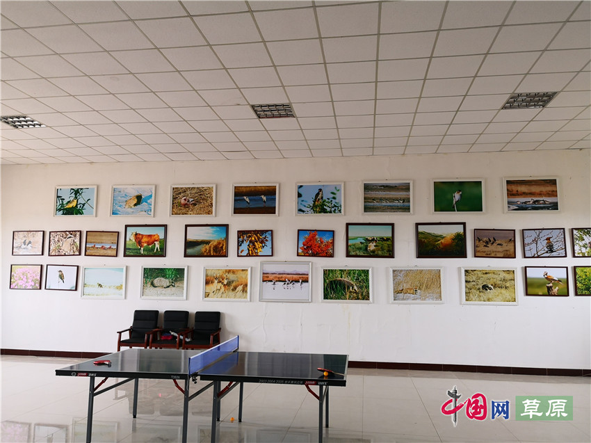 薩如拉圖雅嘎查農牧民培訓基地展廳,墻上掛滿了廷·巴特爾牧場野生動植物攝影作品