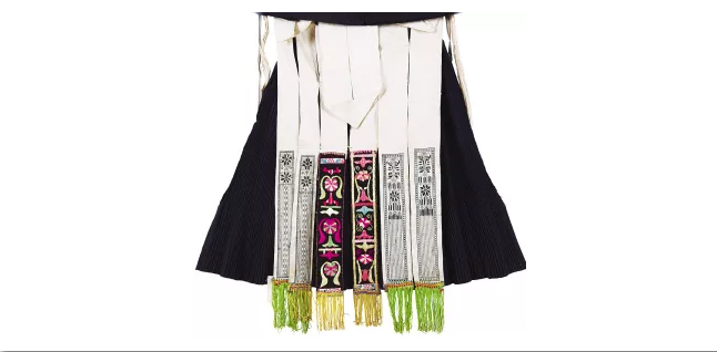 與北方少數民族圍腰的簡練大氣相比,南方少數民族的圍腰則更顯秀美精細,且常常佩戴前后兩塊圍腰。貴州開陽地區(qū)苗族女子的盛裝造型,就包含了層疊式前圍腰和飄帶式后圍腰:前圍腰分為5層,每層皆以數紗繡為主要裝飾工藝,結合絳子邊與金屬裝飾線,并用棉布進行包邊處理,圍腰面積較大且重量較沉,穿著時系在上衣與坎肩之外,上端兩角自然下翻。后圍腰以本白色棉布為料,分為6條飄帶,裝飾部位集中于飄帶下方,其中左右兩對飾有數紗繡,中間一對則為黑地彩色平繡,飄帶底部還縫綴彩色流蘇,頗具動感。細致的手工裝點出苗家女子之貌美,也彰顯著苗家女子之手巧。