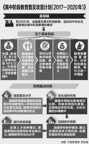 “高中教育是選擇性教育,僅僅提供學(xué)位,缺乏吸引力,學(xué)生不愿意上,普及目標(biāo)就難以實(shí)現(xiàn)。”教育部相關(guān)負(fù)責(zé)人解釋說,在確保普及程度的基礎(chǔ)上,要體現(xiàn)全面科學(xué)的普及觀,防止簡(jiǎn)單追求數(shù)量和規(guī)模的增加。因此,除了2020年我國(guó)高中階段教育毛入學(xué)率將要達(dá)到90%這個(gè)總目標(biāo)外,《攻堅(jiān)計(jì)劃》還提出了5個(gè)具體目標(biāo):
