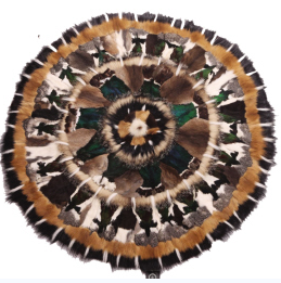 這張拼毯使用了馴鹿、貂熊、紫貂、黃鼬等多種獸皮毛,整體呈放射狀向外延展,構(gòu)圖嵌色五彩斑斕,品質(zhì)十分精美。為了制作這張拼毯,老人花了整整5年時間收集獸皮。僅野鴨頭頸部的一小塊孔雀綠羽毛,她就收集了近40塊,成為了整塊拼毯的亮點(diǎn)。