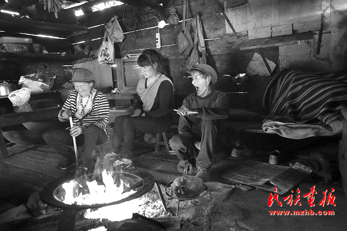 木壘房里,獨(dú)龍族一家人圍坐在火塘邊烤火