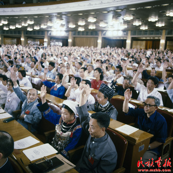 1984年5月31日,中華人民共和國第六屆全國人民代表大會第二次會議通過了《中華人民共和國民族區(qū)域自治法》,自1984年10月1日起施行。民族區(qū)域自治制度是我國的一項(xiàng)基本政治制度。圖為各族代表舉手表決通過《中華人民共和國民族區(qū)域自治法》《民族畫報(bào)》2009年慶祝中華人民共和國成立60周年???/p>