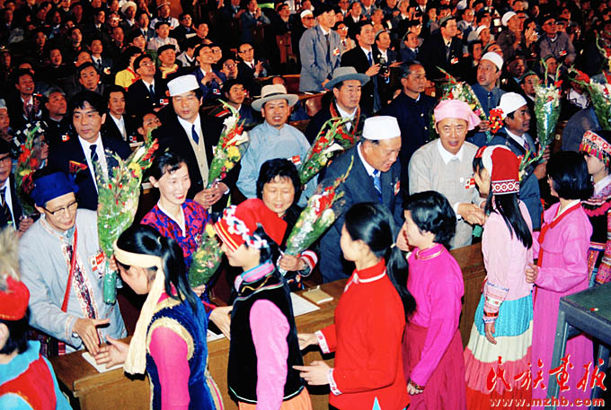 1988年4月25日至29日,首次全國民族團(tuán)結(jié)進(jìn)步表彰大會在北京舉行,圖為大會現(xiàn)場.《民族畫報(bào)》1988年第8期