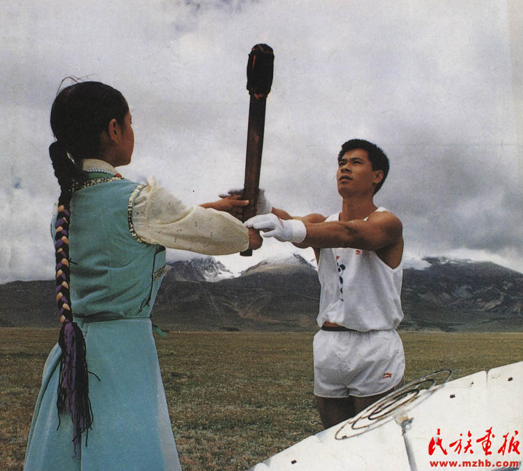 1990年,象征著亞洲30億人民“團(tuán)結(jié)、友誼、進(jìn)步”的第十一屆亞洲運(yùn)動會在中華人民共和國首都北京隆重開幕。8月7日,在西藏的念青唐古拉峰下,藏族少女達(dá)娃央宗點(diǎn)燃火把,傳遞給前世界冠軍、“體操王子”李寧(壯族),李寧接過圣火,點(diǎn)燃了火種盒內(nèi)的火種《民族畫報(bào)》1990年第11期