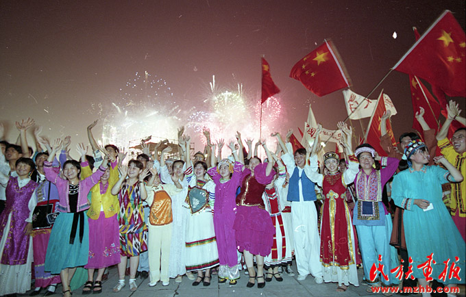 1997年7月1日零點(diǎn),中華人民共和國國旗和香港特別行政區(qū)區(qū)旗在香港升起,經(jīng)歷了百年滄桑的香港回到祖國的懷抱,中國政府開始對香港恢復(fù)行使主權(quán)。香港回歸祖國,舉國上下一片歡騰。各族人民以隆重而熱烈的方式,歡呼五星紅旗在香港特別行政區(qū)高高飄揚(yáng)。圖為首都各民族學(xué)生熱烈慶祝香港回歸。《民族畫報(bào)》1997年第9期