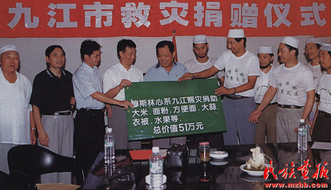 1998年,長江發(fā)生了全流域的特大洪水,災(zāi)情牽動著全國各族人民的心,舉國掀起了“情系災(zāi)區(qū)、奉獻(xiàn)愛心”的賑災(zāi)熱潮。圖為回族企業(yè)代表在江西省九江市政府舉行捐贈儀式?!睹褡瀹媹?bào)》1998年第12期