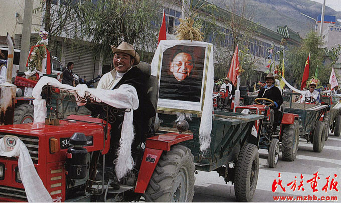 2004年8月21日,西藏山南地區(qū)乃東縣的農(nóng)牧民高懸鄧小平畫像,開著拖拉機(jī)在山南街頭巡游,表達(dá)對改革開放總設(shè)計(jì)師鄧小平同志的深切緬懷。改革開放后,西藏自治區(qū)農(nóng)牧民的年人均收入已從改革開放初期的幾百元上升至2004年的2000元左右,西藏城鎮(zhèn)居民年收入則超過7000元,位居西部前列?!睹褡瀹媹?bào)》2008年第12期