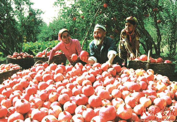 興邊富民行動是1999年中央民族工作會議部署的一項(xiàng)重要的邊境建設(shè)工程,旨在“富民、興邊、強(qiáng)國、睦鄰”。興邊富民行動為新疆的發(fā)展帶來了實(shí)惠,2006年,看著豐收的石榴,維吾爾族農(nóng)民樂開了花。《民族畫報(bào)》2007年7期