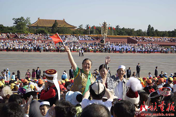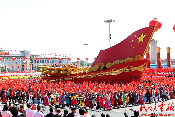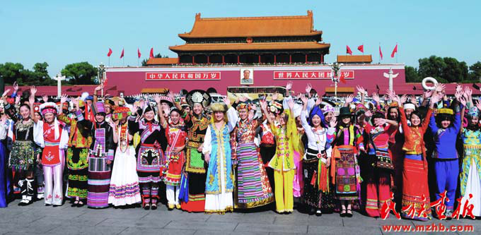 新中國成立以來,黨和國家始終堅(jiān)持把馬克思主義民族理論同中國民族問題具體實(shí)際相結(jié)合,始終堅(jiān)持把民族工作作為一項(xiàng)重大工作來抓,團(tuán)結(jié)帶領(lǐng)全國各族人民共同團(tuán)結(jié)奮斗,共同繁榮發(fā)展,開創(chuàng)了中國特色解決民族問題的正確道路,取得了舉世矚目的成就,積累了彌足珍貴的成功經(jīng)驗(yàn)。2009年10月1日,在北京天安門廣場,20萬軍民以盛大的閱兵儀式和群眾游行歡慶新中國60華誕,圖為各民族學(xué)生參加“團(tuán)結(jié)奮進(jìn)”方陣群眾游行?!睹褡瀹媹?bào)》2009年第10期