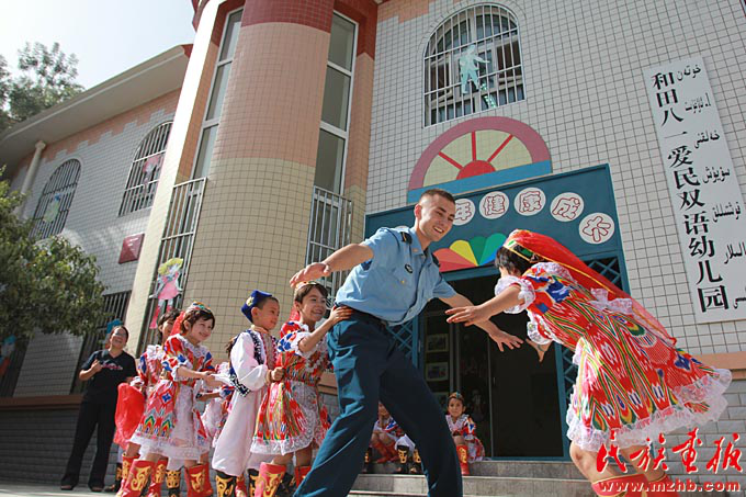 民族團(tuán)結(jié)是國家統(tǒng)一、繁榮昌盛的前提和保證,各民族“共同團(tuán)結(jié)奮斗,共同繁榮發(fā)展”是我國民族工作的主題。全國各地扎實(shí)開展民族團(tuán)結(jié)進(jìn)步創(chuàng)建工作,平等團(tuán)結(jié)互助和諧的社會主義民族關(guān)系進(jìn)一步鞏固和發(fā)展。2011年,空軍駐新疆和田某指揮所首次投資80萬元,開辦了和田八一愛民雙語幼兒園,讓30個家庭的孩子進(jìn)入雙語班成為首批“藍(lán)天春蕾兒童”。圖為維吾爾族戰(zhàn)士艾力夏提和該園兒童一起玩老鷹捉小雞游戲?!睹褡瀹媹?bào)》2011年第11期
