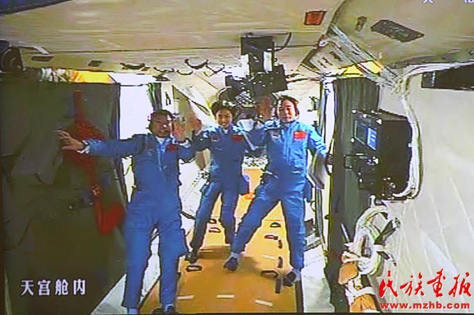 2012年6月18日,神舟九號飛船與天宮一號完成自動交會對接,兩飛行器形成穩(wěn)定運(yùn)行的組合體后,三位航天員先后進(jìn)入天宮一號目標(biāo)飛行器,這實(shí)現(xiàn)了中國載人航天歷史上首次對一個在軌運(yùn)行的航天器的拜訪和駐留。圖為在北京航天飛控中心大屏幕拍攝到的航天員景海鵬、劉旺、劉洋在天宮一號實(shí)驗(yàn)艙內(nèi)的畫面。《民族畫報(bào)》2012年第7期
