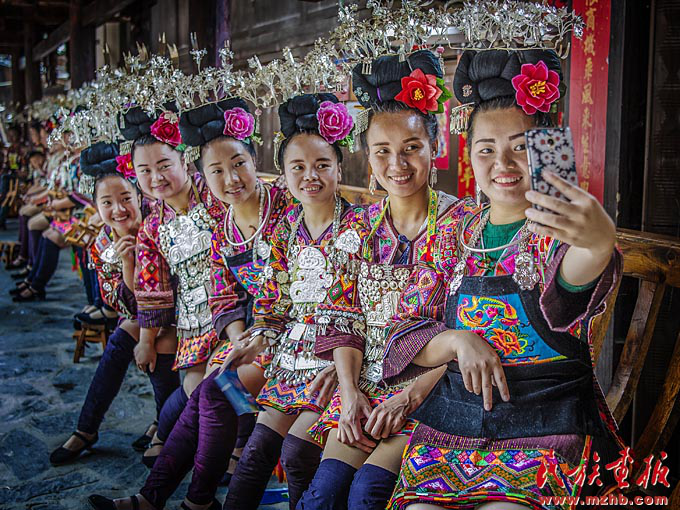 經(jīng)歷改革開放40年的發(fā)展,我國社會生產(chǎn)力、綜合國力、人民生活水平實(shí)現(xiàn)了歷史性跨越,全黨全國各族人民要更加緊密地團(tuán)結(jié)在以習(xí)近平同志為核心的黨中央周圍,高舉中國特色社會主義偉大旗幟,不忘初心,牢記使命,將改革開放進(jìn)行到底,不斷實(shí)現(xiàn)人民對美好生活的向往,在新時(shí)代創(chuàng)造中華民族新的更大奇跡。圖為貴州民眾盛裝自拍。《民族畫報(bào)》2018年第3期