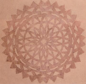 該剪紙出土于吐魯番市阿斯塔那303號(hào)墓,不僅保存完好,而且構(gòu)圖對(duì)稱、畫面均勻、線條流暢、美觀大方,可以和現(xiàn)代民間剪紙藝術(shù)相媲美。剪紙為圓形,呈土黃色,中心圖案為八角花形,依次向外為兩圈菱形花紋,交叉錯(cuò)落,排列有序;再向外圈為梯形紋組成的三角形邊飾。整個(gè)剪紙圖案層次分明,變化繁復(fù),頗有韻律感。這幅剪紙為折疊后一次剪成,造型簡(jiǎn)潔,刀法洗練,具有古樸濃郁的民間風(fēng)格。