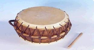 鼓框為木質,兩面蒙皮,用繩索固定在木框兩邊。鼓鏈木質,通常在表演中負責敲擊主要旋律的重拍,也有獨奏的情況,聲音有力。