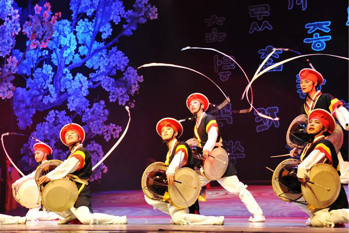 “四物樂”,朝鮮語為????。四物樂是由韓國著名民俗家沈雨晟先生命名的,20世紀90年代傳入我國吉林延邊朝鮮族自治州?!八奈飿贰庇尚¤專???)、鑼(?)、長鼓(??)、圓鼓(?)四種樂器演奏音樂,并且由此音樂來做游戲。每種樂器都是以大自然的聲音來形成的。小鑼象征風,長鼓象征雨,圓鼓象征雷,鑼象征電。