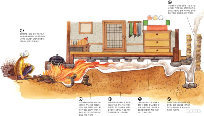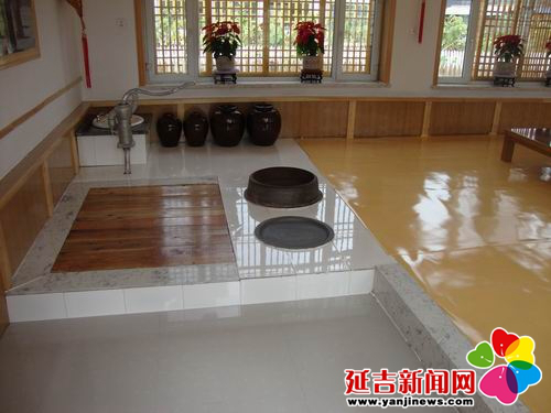 在傳統(tǒng)的朝鮮族民宅中,炕和鍋臺是平齊的,需要燒火做飯時,主婦會打開架在柜臺一側(cè)的移動木板,下到地面水平線以下的“灶坑”點火做飯。傳統(tǒng)的炕采用長筒式結(jié)構(gòu),煙火由一洞內(nèi)循環(huán)排出,使每洞都有煙火串入,炕即溫?zé)?。朝鮮族的火坑高度為30-40厘米,但炕洞向下挖入,炕面抹白灰,表面糊油紙或鋪草簾子,炕面平整。隨著物質(zhì)條件的改善,炕面改鋪纖維板或者地板膠,既美觀又耐用。