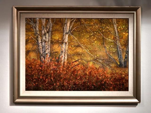 本作品表現(xiàn)的是深秋時(shí)節(jié)森林金黃,白樺樹(shù)落葉點(diǎn)點(diǎn)、露出白色枝干的景象。整體繡面用色豐富多彩,炫而不俗;針?lè)`活多變,層次鮮明,仿佛置身其間,給人以美的享受。