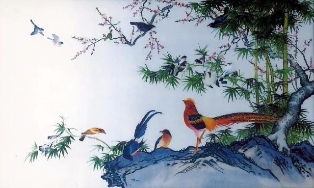 取材于古畫(huà),采用蜀繡的運(yùn)針、輔針、切針、沙針、滾針、打籽針等針?lè)ɡC制。樹(shù)木花草層次分明、古樸自然,錦雞蝴蝶色彩艷麗。