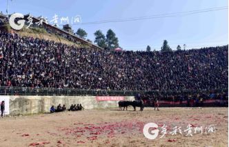貴州省從江縣第十五屆原生態(tài)侗族大歌節(jié)的前一天,恰逢該縣逢亥斗牛日,丙妹鎮(zhèn)松學(xué)斗牛塘、谷坪鄉(xiāng)四寨河斗牛塘同時(shí)舉辦傳統(tǒng)牛王爭霸賽,喜迎一年一度“侗族大歌節(jié)”的到來,共有來自周邊村寨的80頭水牯牛參戰(zhàn),斗牛活動場上名牛角逐,場面異彩紛呈,吸引數(shù)萬名觀眾前來觀戰(zhàn)。