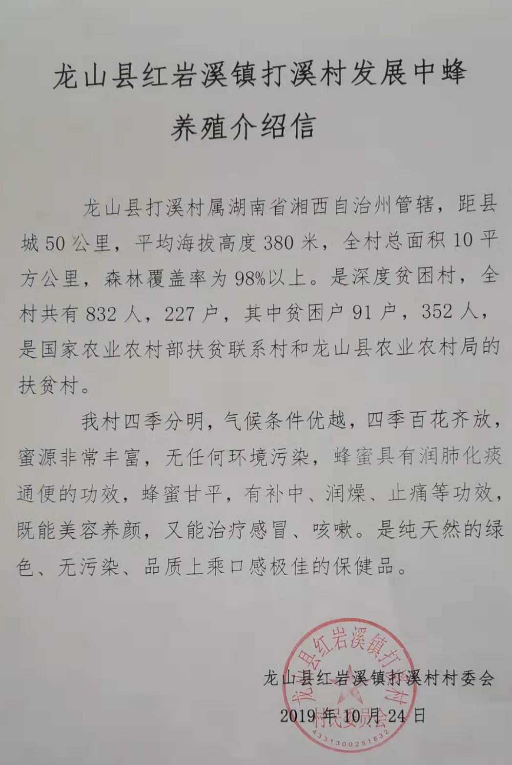 這里四季分明,氣候條件優(yōu)越,四季百花齊放,蜜源非常豐富,無任何環(huán)境污染。據(jù)湖南省湘西州龍山縣紅巖溪打溪村支部書記沈世平介紹:“我們這兒已經(jīng)有很長的養(yǎng)殖蜜蜂的歷史,環(huán)境無污染,田土少,屬于純天然養(yǎng)殖,無農(nóng)藥,利于中蜂的養(yǎng)殖,并且在2019年4月份的時候,通過農(nóng)業(yè)部及農(nóng)業(yè)科學院的專家實地考察,認證為最佳養(yǎng)蜂環(huán)境。今年獲得鄉(xiāng)政府幫扶,規(guī)劃從龍山縣中心養(yǎng)殖合作社引進50箱進行集中養(yǎng)殖,明年開始分設(shè)4點,一個點150箱,擴大產(chǎn)量,并向全縣推廣?!?/p>