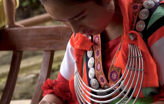 谷灑村苗族服飾上的圖案,呈現(xiàn)多元化的風(fēng)格,這是因?yàn)槊缱迮拥姆椡汲鲎运齻冏约旱氖种?,每件服飾都有著個(gè)人風(fēng)格。谷灑村苗族喜歡在古井的涼亭上刺繡,這里涼風(fēng)習(xí)習(xí),是她們納涼刺繡最好不過的地方。同伴坐在一起,這樣以便于互相指點(diǎn),學(xué)習(xí)對(duì)方的長處、彌補(bǔ)自己的短處。