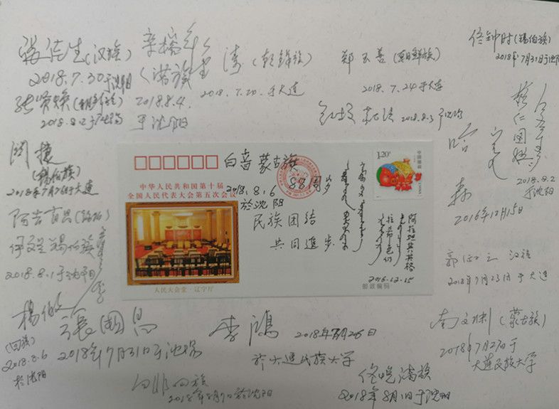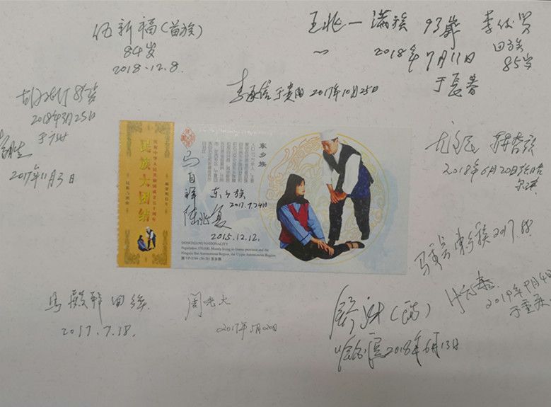 在采集口述影像錄音資料的同時,項目組還收集了大量的珍貴歷史照片以及相關文物。值得一提的是,他們設計了一種非常有特色的受訪者簽名簿,中間貼著繪有56個民族的音樂舞蹈圖案的首日封或明信片,四周簽上受訪者的人名簽名字、民族特征,有些還用民族文字書寫,體現(xiàn)了中華各民族團結(jié)在一起的精神風貌。簽名簿有厚厚的幾大本,設計精美,承載著民族工作口述史資源采集的經(jīng)歷,具有豐富的文化內(nèi)涵和博物館收藏價值。