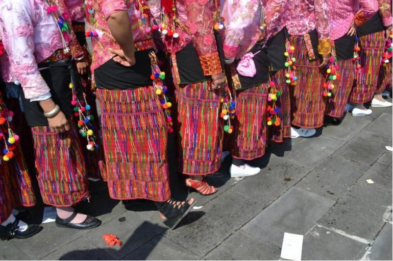 筒裙是阿昌族已婚婦女的服飾。分為無花紋的“素筒裙”和有花紋的“摳花筒裙”兩種?!皳富ㄍ踩埂敝饕餍杏诹汉拥貐^(qū),其制作從紡線印染到制經(jīng)緯線,再織成布,均采用傳統(tǒng)手工藝方法。上用各色蠶絲線摳織有“阿波花”“節(jié)子花”、“筒子花”、“香爐花”、“梨翁花”、“李子花”等與阿昌族日常生活關(guān)系密切的花紋圖案。