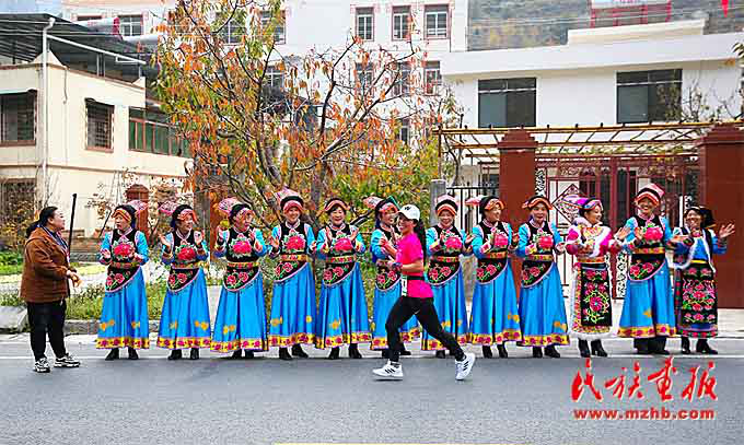 運(yùn)動員們在奔跑中感受熱熱鬧鬧的羌?xì)v年,體驗(yàn)節(jié)奏明快的沙朗舞,近距離接觸古樸厚重的羌族文化。