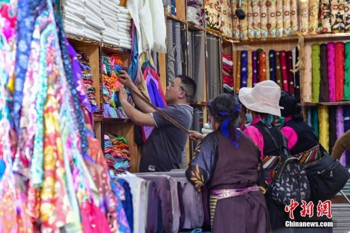 圖為7月24日,幾位藏族婦女在拉薩老城區(qū)八廓街上的藏裝店內選購藏裝。 中新社記者 貢嘎來松 攝
