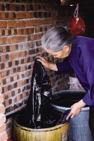 只見缸中漂浮著藍(lán)色蘑菇狀的泡沫,中間不規(guī)則的隙孔像是在呼吸。一旁的燦爛覺得好玩,找來一塊布條想放到染缸里,被拒絕了。“不能用臟的布,要保持清潔?!秉S奶奶正聲說。