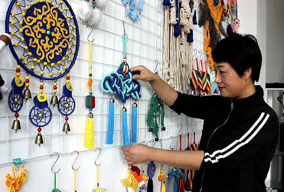 此外,繩結技藝傳承人把傳統(tǒng)工藝帶去了鄉(xiāng)村,讓傳統(tǒng)手工藝也成為了扶貧的一種助力。她們組織村里的婦女進行培訓、學習。通過手工藝術村里的婦女們有了生存的技能,目前大多數(shù)村民及貧困戶在第一次培訓的基礎上,已經(jīng)充分掌握了繩結技藝,能夠編織出一個合格的繩結產(chǎn)品,變成了名副其實的“巧娘”。她們扶貧村有協(xié)日塔拉嘎查、四方地村等。