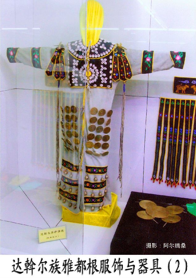 在達斡爾族人部分轉向農業(yè)生產后,他們的觀念意識也發(fā)生了一些變化,雅德根服飾隨之有所演變,雙肩的鳥使者為布谷鳥所替代,成為春天的使者,神肩上360個海貝飾品表示360天,24條長短飄帶象征農歷的24個節(jié)氣 。